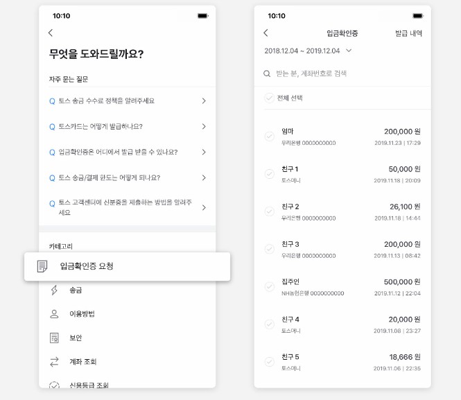 토스의 경우를 예로 들면 '입금확인증 요청' 같은 메뉴가 따로 있어서 원하는 기간, 누구에게 돈을 송금했는지 내역을 확인할 수 있습니다. 내가 월세를 보낸 내역만 따로 모아서 인쇄를 하면 됩니다.