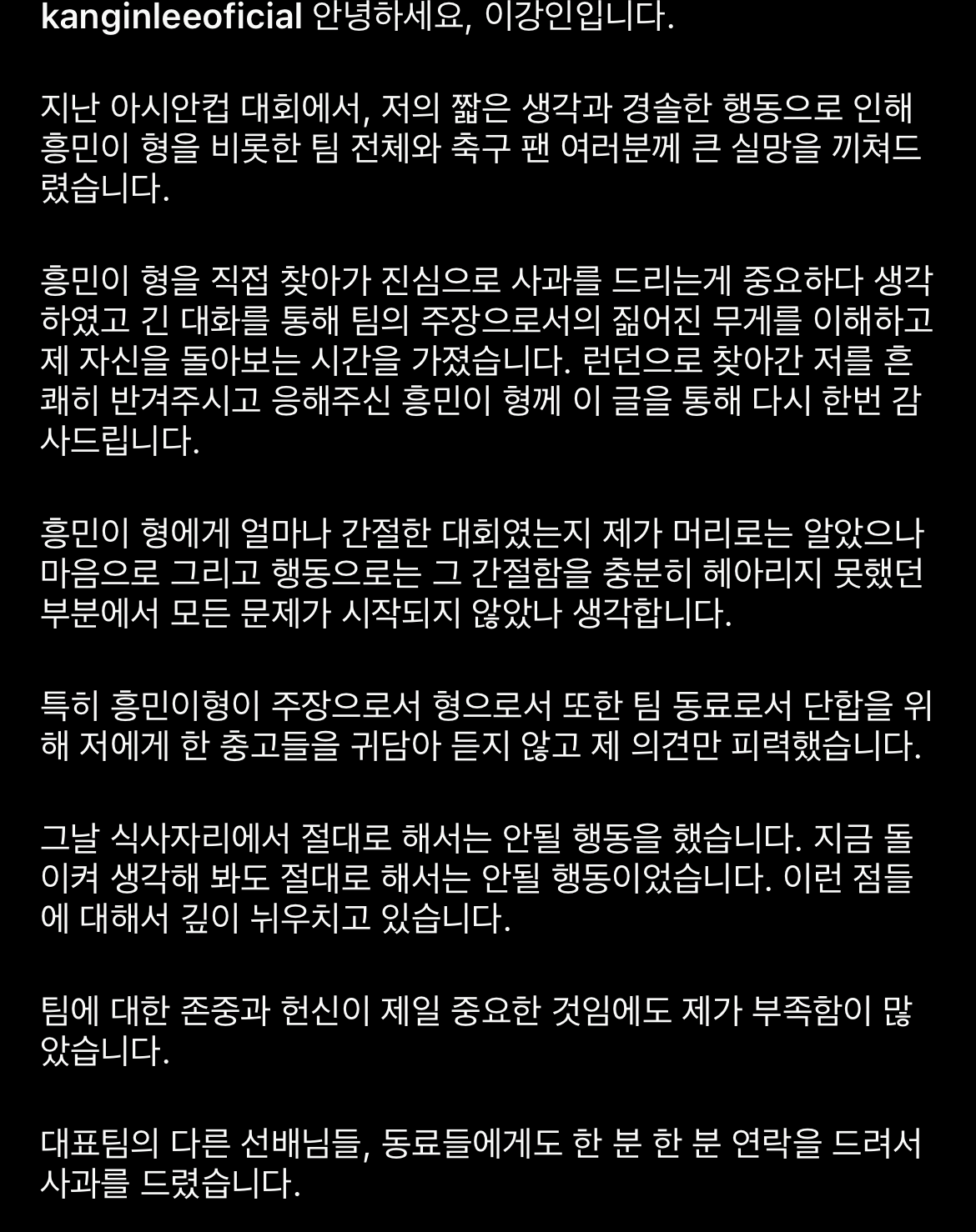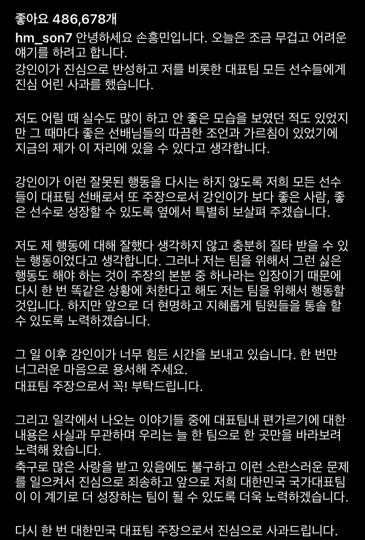 손흥민의 입장문은 주장의 품격이 느껴지는 글이었다. 먼저 자신에 대해도 '저도 실수를 많이 했었다', '나도 잘한 행동은 없다'라고 먼저 언급하고 강인이의 잘못까지 감싸주는 느낌이다. 대표팀 주장으로서 사과드린다는 말과 강인이를 너그러운 마음으로 용서해 달라는 말에서 팀을 먼저 생각하는 게 느껴진다.