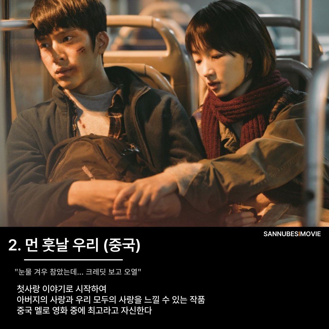 중국에서는 '먼 훗날 우리'가 첫사랑 대표작으로 손꼽힌다. 이 영화는 단순한 로맨스를 넘어서 가족과의 사랑도 보여준다. 크레딧 장면은 관객에게 깊은 여운을 남기며, 이별 후의 아픔과 회상을 아름답게 그려낸다. 본편에서도 울음을 겨우 참았다가 크레딧 보면서 눈물을 펑펑 쏟았던 기억이 있다.